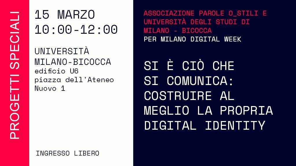 Giovedì 15 marzo interverremo alla Milano Digital Week con il workshop: “Si è ciò che si comunica: costruire al meglio la propria digital identity”.