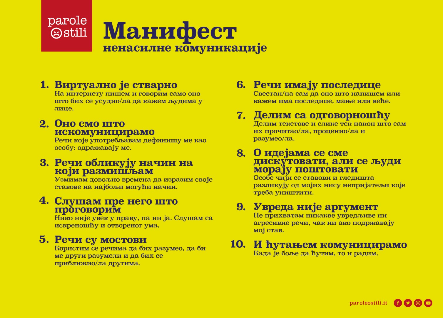 Il Manifesto è una carta che elenca dieci princìpi di stile, utile a migliorare lo stile e il comportamento di chi sta in Rete.